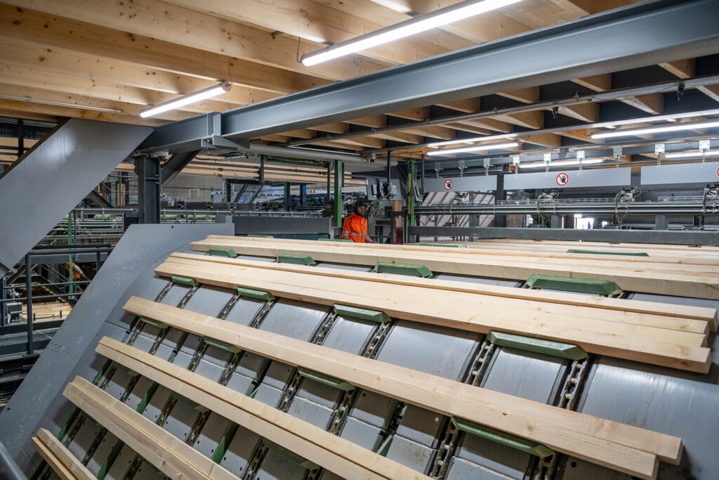 Das Schnittholz wird vermessen und durch einen Fachmann nach visueller Qualität sortiert. Die Anlage bildet automatisch Schnittholzpakete durch Legen der Trocknungslatten.